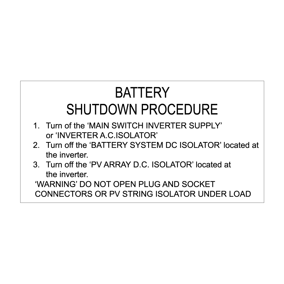 Enhance safety with our Battery Shutdown Procedure (3 Lines + Warning) Label, measuring 120mm x 60mm. Made from high-quality traffolyte material, this fully engraved label features a clean white background with bold black writing for excellent visibility. Designed for easy application, it comes with a strong adhesive backing to ensure secure attachment. Ideal for both residential and commercial settings, this label provides clear instructions and a warning for safely shutting down your battery system, promoting safety and clarity in your energy management.